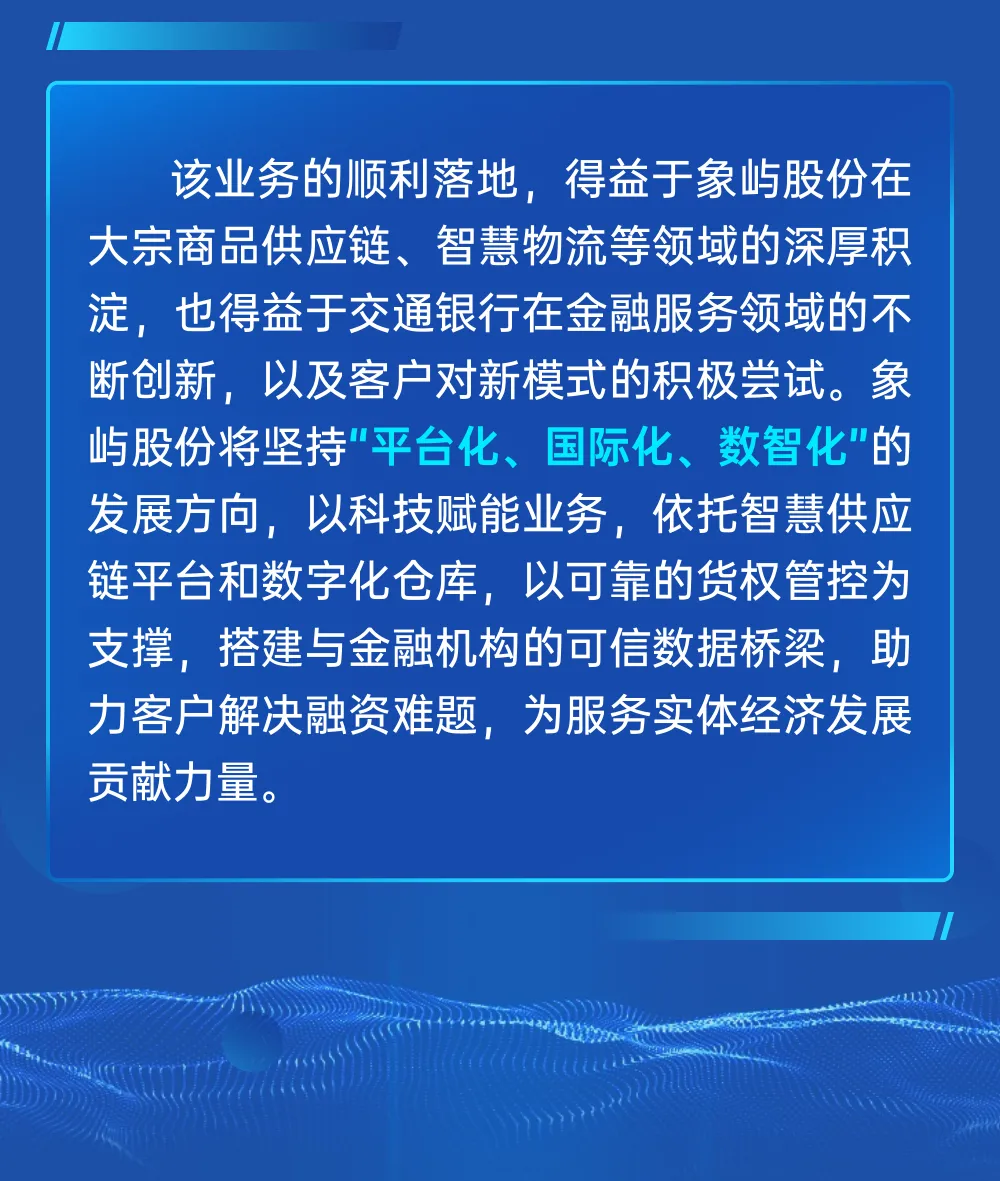 象嶼“嶼倉融”助力交行“普惠E貸”數(shù)字倉單質(zhì)押融資業(yè)務(wù)成功落地!