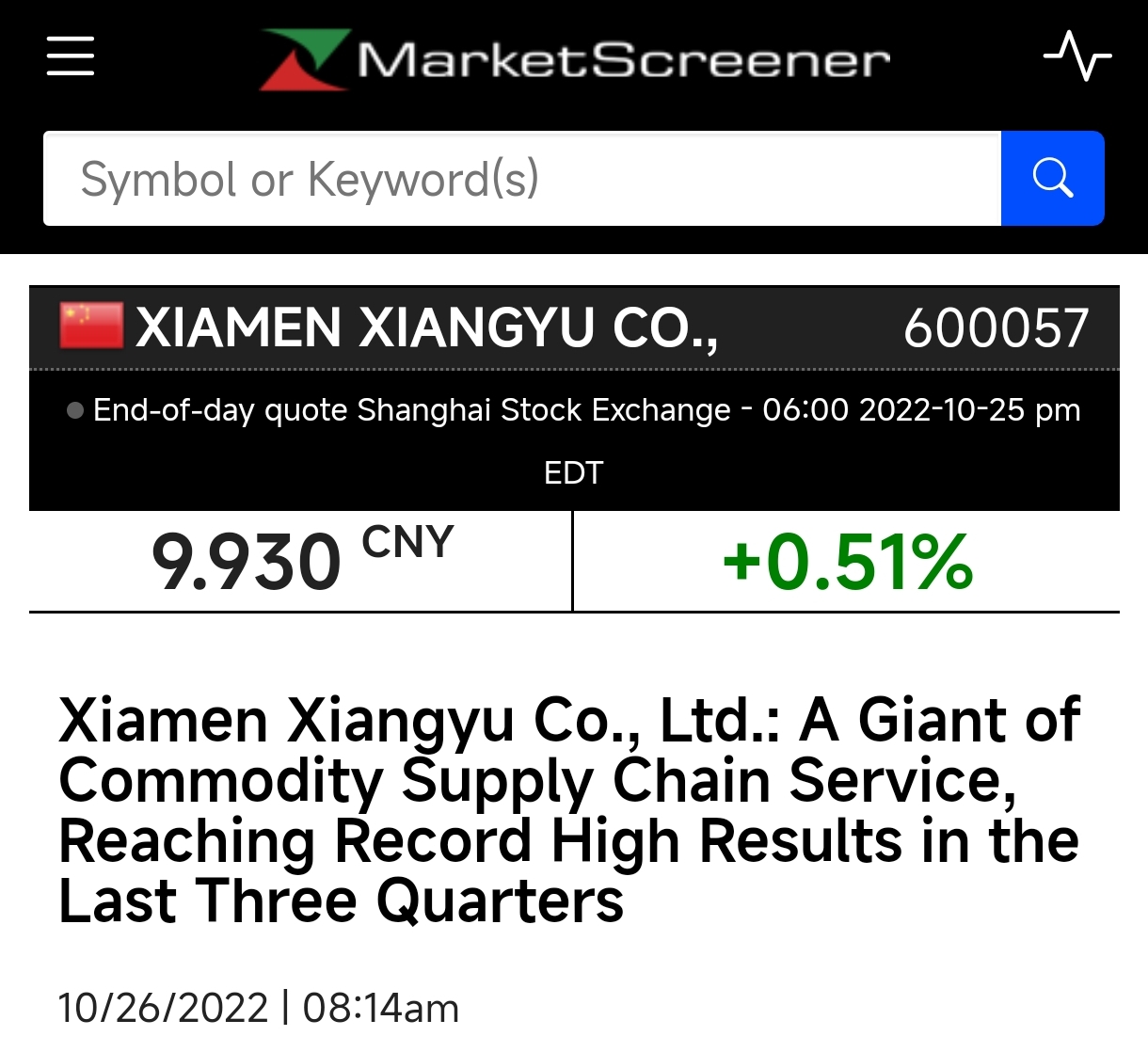 10月26日晚間,廈門象嶼(600057.SH)發(fā)布第三季度財報,2022年前三季度,公司實現(xiàn)營業(yè)收入3,918億元,同比增長13.74%;歸母凈利潤21.73億元,同比增長31.23%;凈資產(chǎn)收益率15.26%,同比增加1.91個百分點。公司營業(yè)收入、歸母凈利潤均創(chuàng)同期歷史新高,經(jīng)營效益持續(xù)提升。